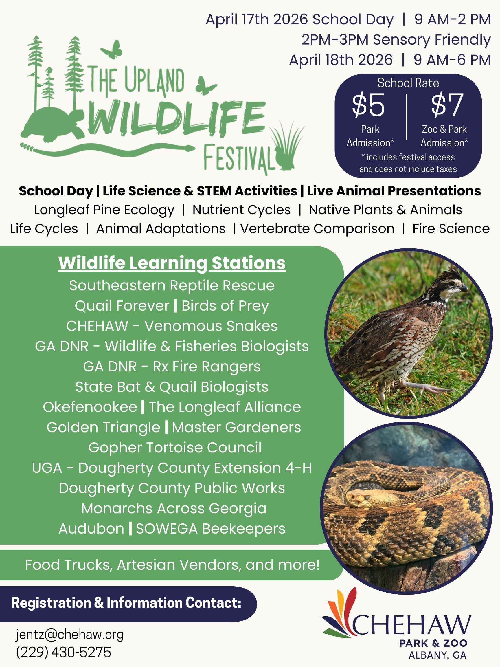 Plan an unforgettable field trip at the Upland Wildlife Festival – School Day, where students explore science in action through hands-on discovery and live animal encounters. On April 17, 2026, classes can spend the day going through wildlife learning stations and STEM-focused activities covering longleaf pine ecology, nutrient cycles, fire science, animal adaptations, vertebrate comparisons, and Georgia’s native plants and animals.